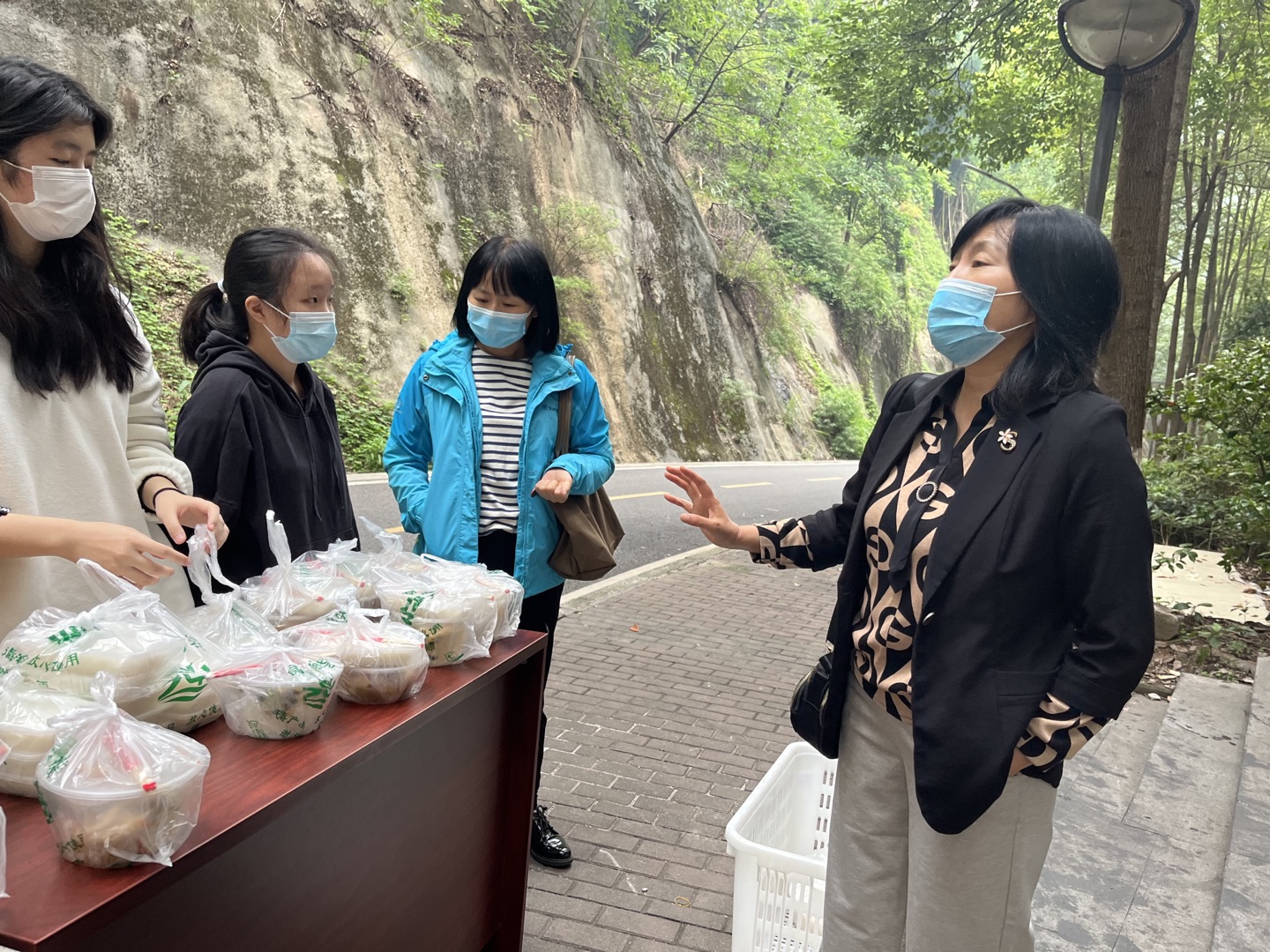 领导班子带领辅导员、志愿者全部下沉到防疫前线,积极投身疫情防控工作,分组排班参与志愿服务,快速构筑起抗击疫情的坚固防线。他们不顾自己的“小家”,义无反顾踏上了保卫“大家”的路。为了让学生能吃上一口热乎的饭菜,李自维书记、宋瑛副院长、黄潇副院长亲自带领辅导员来到食堂,卷起袖子加入了“盛饭大军”、“送饭大军”的队伍。为丰富学生的膳食营养,宋瑛副院长还亲自采购了一批零食、水果,送到各学生宿舍楼。他们用实际行动保卫学生的身体健康、践行着“敬业爱生”的铮铮誓言。