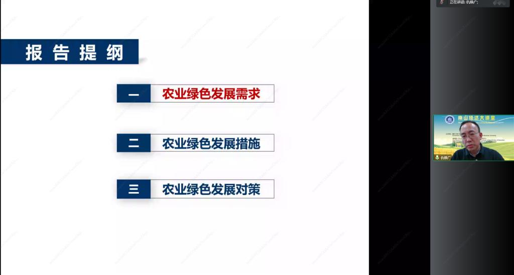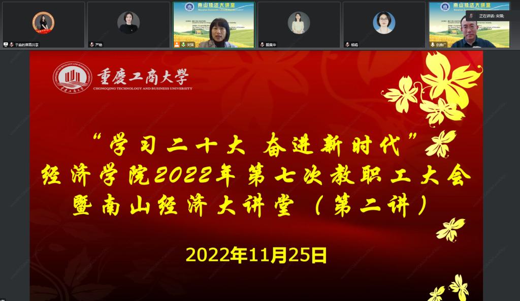 党的二十大,是在全党全国各族人民迈上全面建设社会主义现代化国家新征程、向第二个百年奋斗目标进军的关键时刻召开的一次十分重要的大会。为深入学习宣传贯彻党的二十大精神,11月25日下午,太阳成tyc7111cc召开“学习二十大 奋进新时代”第七次教职工大会暨南山经济大讲堂(第二讲)。本次会议由太阳成tyc7111cc院长宋瑛主持,特邀教育部长江学者特聘教授、中国人民大学农业与农村发展学院院长仇焕广在线做主题讲座,太阳成tyc7111cc三百余名师生通过视频会议参会学习。