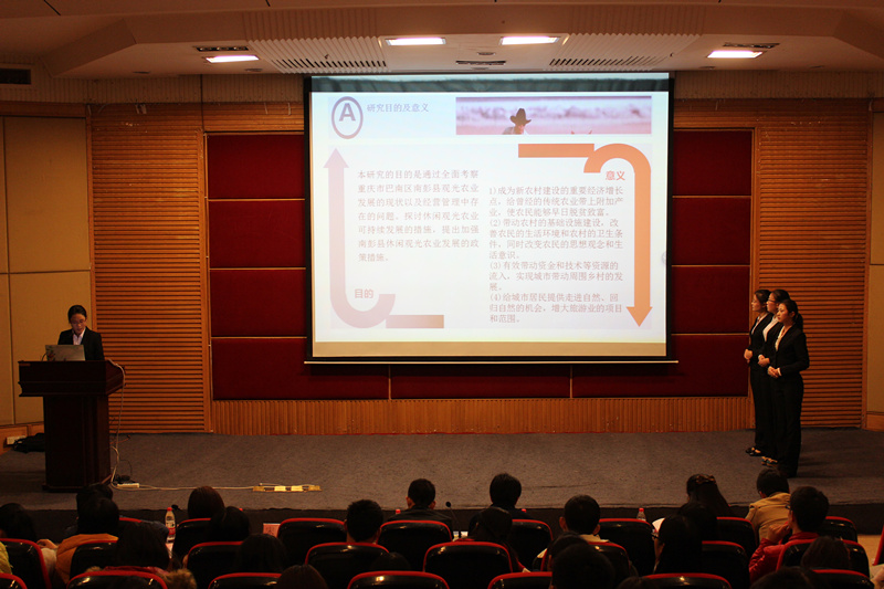 主持人致开幕词并宣布比赛开始,比赛环节分为“风采展示”、“调研报告” 和“嘉宾点评”。各参赛队伍分别展示了调研过程中的独特风采后,进入本场最重要的调研报告展示环节,其中关于重庆巴南区南彭镇农业专业合作社发展情况调研、巴南区都市观光农业发展路径调研、以及农村“空巢”老人生活状况及养老对策的调研等调研课题都紧贴社会民生;正如雷菁副书记所言:“本次活动打造了优秀的团队,达到学以自用的效果,本次活动打开大学生关注民生的渠道,发展大学生全面素质。”最终,“湛蓝梦想”队凭借全场最高分赢取决赛一等奖。
