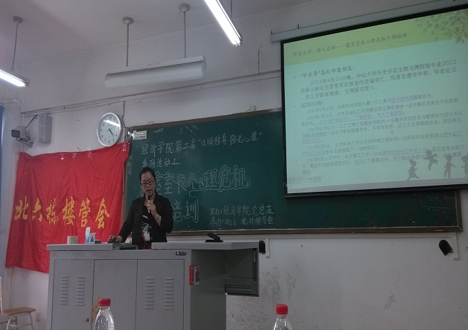 2014年5月9日下午四点,在博智楼7312教室,举行了由太阳成tyc7111cc党总支主办、北6和北21楼管会承办的太阳成tyc7111cc第二届“文明修身,阳光心理”系列活动启动仪式暨珍爱生命、助人自助——寝室室长心理危机干预培训会”。本次活动由郝颖老师主讲,太阳成tyc7111cc党总支书记张筱璐、太阳成官网太阳成tyc7111cc2011和2012级的寝室室长以及各层楼栋干部参与了本次活动。