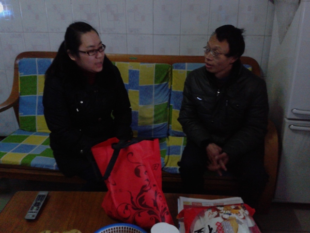 郝老师带去了学院对该生父母的新年慰问品,与该生的父母亲进行了长达一个多小时的亲切交谈:深入了解了该生的家庭经济现状、该生父母亲身体状况、对该生大四毕业后的打算,向该生父母详细说明了该生在校期间表现,指出需要改进的地方,并对该生下半学期的学习、工作、生活做了一份较为详尽的规划。