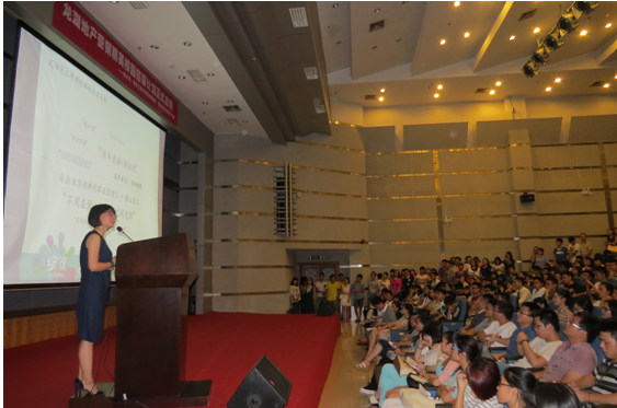 宣讲会在一段洋溢着蓬勃朝气的宣传片中拉开帷幕,富有青春活力和充满正能量的往届绽放生的心得与鼓励立刻吸引了同学们的目光。重庆龙湖地产人力资源负责人于清源女士结合精致的幻灯片详细地讲述了房地产行业的发展状况以及龙湖地产的竞争优势和企业文化,其专业性强且简明清晰的语言风格收获了在场同学们的阵阵掌声。在她介绍到龙湖的历史性飞跃时期和企业优秀独特的价值观念时,更是引发同学们的声声惊叹,让大家深刻的感受到了龙湖地产的良好前景。同时,工商大学2013届的毕业生毛颖文和方方亮,也就是重庆龙湖地产往届“绽放生”,他们先后上台分享了他们在龙湖地产的个人经历,表达了对龙湖地产的感情和内心的感受,并为同学们提出了相关建议。整个宣讲过程中,龙湖地产对营销人才的培养和“志存高远,坚韧踏实”的用人理念引发了大家的强烈共鸣。在交流互动环节,同学们纷纷举手提问,重庆龙湖地产人力资源负责人于清源女士都进行了一一解答。
