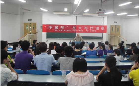傅德岷教授为同学们阐释了他对“中国梦”的理解,他从“中国梦”的提出,提出的意义和重要性等几个方面,结合自己对政治时事的看法,和自己的亲生经历及领悟,为大家做了指导。傅教授鼓励同学们要心怀“中国梦”,弘扬中国传统美德。要有梦,敢于去追求,敢于翻陈出新,敢于去创造奇迹,争取为实现本国的“中国梦”而做出自己的贡献。谈及本次“中国梦”征文比赛,傅教授从个人,家庭,道德水准等多方面,结合本次征文比赛的主题,为同学们详细讲解了写作的切入点,同时还为大家分享了他在几十年教学生涯中的宝贵写作经验,同学们获益匪浅。与此同时,傅教授还告诫同学们,文章的写作切忌抄袭,要有自己的风格,写出自己的特色。