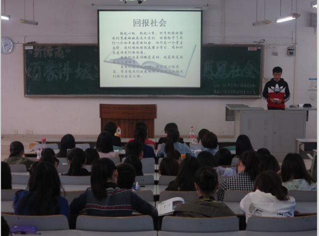 3月22日下午,由太阳成tyc7111cc分团委学生会主办,太阳成tyc7111cc分团委办公室承办的“新儒商”系列活动之《百家讲坛》第一讲“感恩社会”讲座在博智楼7408教室顺利举行。