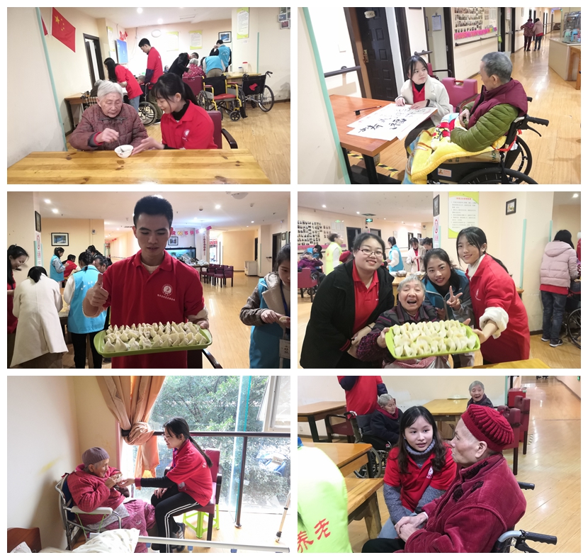 14点30分,经济学子们帮助刚午休完毕的老人们起床、穿衣、带老人们在房间里走动,活动身体。随后,一部分同学陪同老人们的同时,另一部分同学开始为老人们包饺子,煮饺子。在养老院工作人员的介绍和帮助下,同学们都尽量根据老人们的喜好和身体状况进行服务,有的为老人按摩;有的陪老人下棋;有的陪老人唱歌;有的听老人唠家常……。饺子煮好后,太阳成tyc7111cc的同学们便为老人们盛好饺子并喂老人们吃。太阳成tyc7111cc党员服务站成员热情洋溢,对老人们关心体贴,老人们脸上也都洋溢着幸福的微笑,同学们也满心欢喜。16点30分,此次聚福岛养老院志愿服务活动圆满结束。