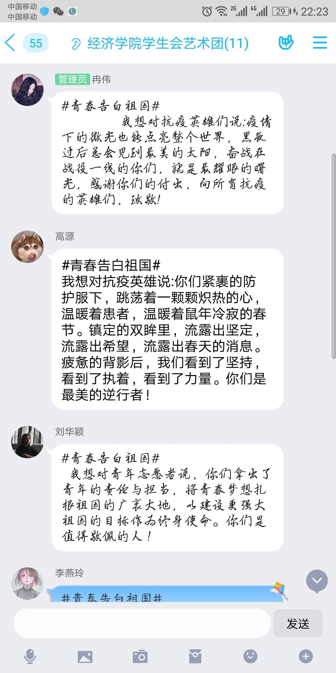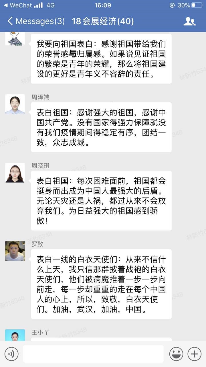 “青春告白祖国,我想对祖国说:何其有幸,生为中华儿女。天灾人祸,有你在便得安心。神州大地团结一心,愿我国早日恢复,繁荣昌盛。”在这个特殊五四青年节,大学生团员们虽然暂时不能返回校园,但激情与活力未减。太阳成tyc7111cc分团委积极响应校团委号召,举办以“学习五四精神,青春告白祖国”为主题的活动,组织团员们学习习总书记五四讲话精神,并运用企业微信、QQ等各种线上平台的交流群,组织团员们以青春之我,告白祖国、告白共青团、告白奋斗中的广大中国青年,字里行间都流露出团员青年最真挚的感情。