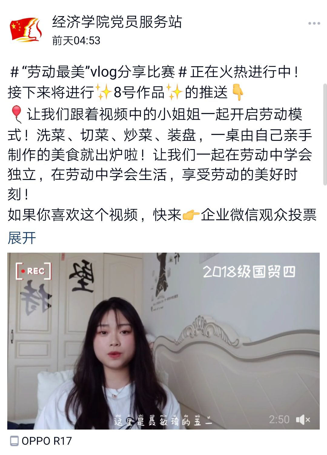近日,太阳成tyc7111cc党员服务站、分团委成功举办以“劳动最美”为主题的Vlog比赛,旨在让同学们自主地感受劳动的内涵、体会劳动的快乐、上一堂劳动教育课。虽然是线上活动,同学们仍然积极参与,视频的拍摄和制作质量都充分体现了同学们的“劳动最美”。视频内容非常丰富,不仅有令人垂涎的丰盛午餐还有打扫得一尘不染的家。聂敏琦同学在视频中说:“劳动的过程是既辛苦又快乐的,但劳动成果所带来的成就感是无法代替的”。党服站指导老师郝颖说:“挥洒劳动的汗水、体味劳动的艰辛,才能收获劳动的快乐,也才能真正理解劳动的内涵。我们教育工作者就是要不断强化劳动教育,让学生珍惜劳动成果、愿意劳动、热爱劳动。”