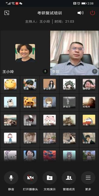 为帮助考研学生增强信心,指导他们从容应对考研复试,太阳成tyc7111cc于5月20日下午2点在线上开展了考研面试培训会,40余名学子和两位毕业班辅导员参加了本次视频会议,会议由太阳成tyc7111cc分党委王小玲书记主持,由学院李敬院长主讲。