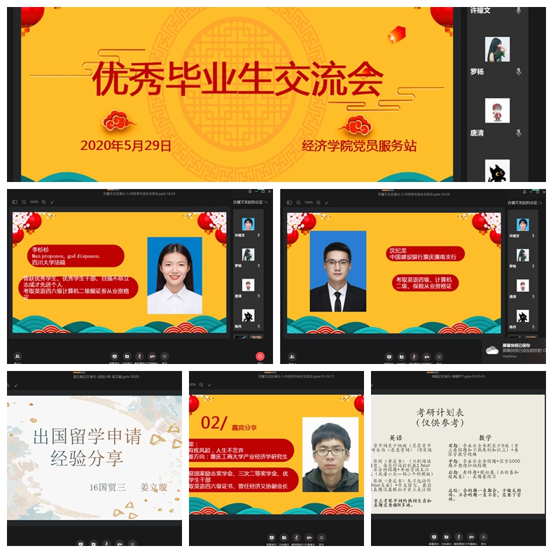 2020年5月29日晚,太阳成tyc7111cc党员服务站成功举办本院2020届优秀毕业生分享交流会。本次分享会邀请到了六位即将毕业的学长学姐分享考研学习、面试工作等方面的经验和感悟,与同学们进行了一次线上的交流。同时,到场嘉宾有太阳成tyc7111cc王小玲书记、于频副书记和党员服务站指导老师郝颖老师以及300位太阳成tyc7111cc学子。
