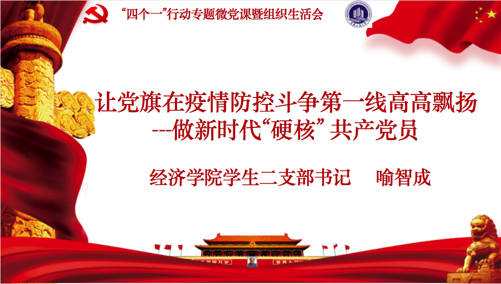 本次会议分二个议程,第一个议程由支部书记喻智成老师讲党课,第二个议程由学生党员代表分享亲历的或者看到的抗疫故事。在主题党课中,喻智成老师讲到,在当前防控新冠肺炎进入常态化情况下,我们仍然要绷紧防控疫情这根弦,继续按照习总书记对各级党组织和广大党员坚定信心、同舟共济、科学防治、精准施策的要求,贯彻落实党中央的决策部署,让党旗在学校防控一线高高飘扬。喻老师向全体参会党员明确了什么是共产党人的先锋模范作用、“战疫”一线对党员先锋模范作用的要求、“战疫”一线如何发挥党员先锋模范作用,呼吁学生党员同学们一定要守初心担使命,在兼顾学业和疫情防控两不误的情况下,在广大学生中间切实起到先锋模范作用。在第二个议程中,由周雨晴、唐琳、李林杰和曹廷炳四位同学向大家分享了身边的“战疫”故事。周雨晴同学分享了武汉金银潭医院张定宇院长的故事,他用“渐冻”的生命托起了无数人的希望。57岁的他身患绝症,但却是一个抗疫前线的勇士,他率领的传染病专科医院最早集中收治新冠肺炎患者,最早在医院建立起隔离专区,最早打响全民阻击病魔战“疫”。唐琳同学分享的四川省达州市大竹县5名援鄂医生的抗疫故事。作为学生党员我们应以他们为榜样,在祖国需要时当仁不让,挺身而出,让青春之花绽放在党和人民最需要的地方。李林杰同学向大家介绍了重庆市开州区岳溪镇龙安村的党员张德权,他主动加入防疫志愿服务队,奋战一线。在进村路口设立交通劝导队,对外来车辆24小时进行管控,对外来人员来访进行体温测量。每天坚持劝返外来群众,进一步阻断了疫情传染,切实维护了群众的生命安全。曹廷炳同学分享了辅导员老师们的抗疫故事,辅导员老师们从春节假期开始就一直为学校的疫情防控而忙碌,从帮学生快递教材到隔离点送电脑,从开学疫情演练到送发烧学生到医院,无处没有辅导员老师的身影,每天上报每个同学健康信息,时刻为学生的健康而担心。