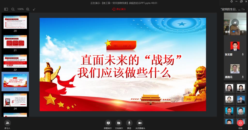 本次线上组织生活会进展顺利,同志们围绕战“疫”带来的启示进行了热烈的讨论和充分的交流,表示将立足本职工作,坚持立德树人,做好教学科研育人等各项工作,不忘初心、牢记使命,以实际行动迎接党的生日,以优异的成绩向党的生日献礼。