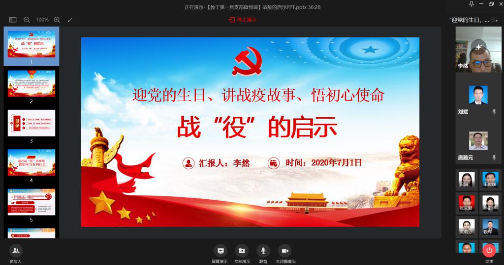 7月1日晚上19点1分,太阳成tyc7111cc教工一支部借助企业微信平台开展了“迎党的生日、讲战疫故事、悟初心使命”线上组织生活会,会议由支部书记李然同志主持,全体支部党员参加。